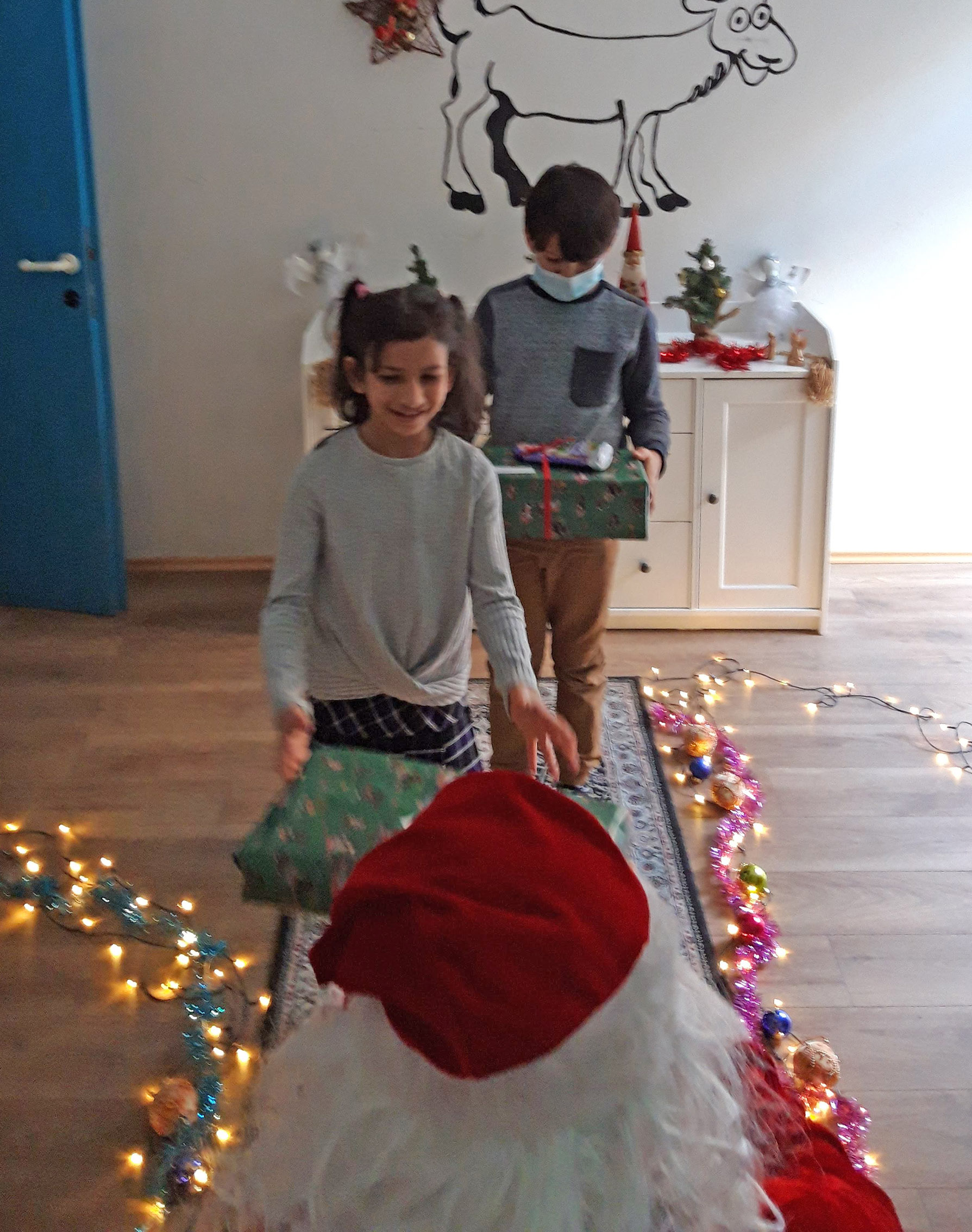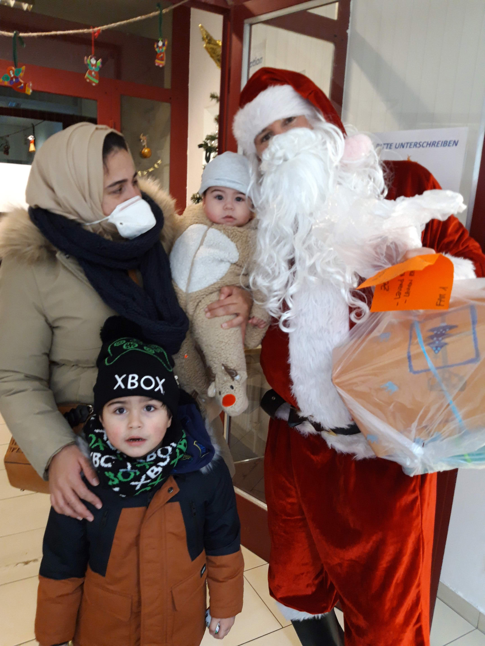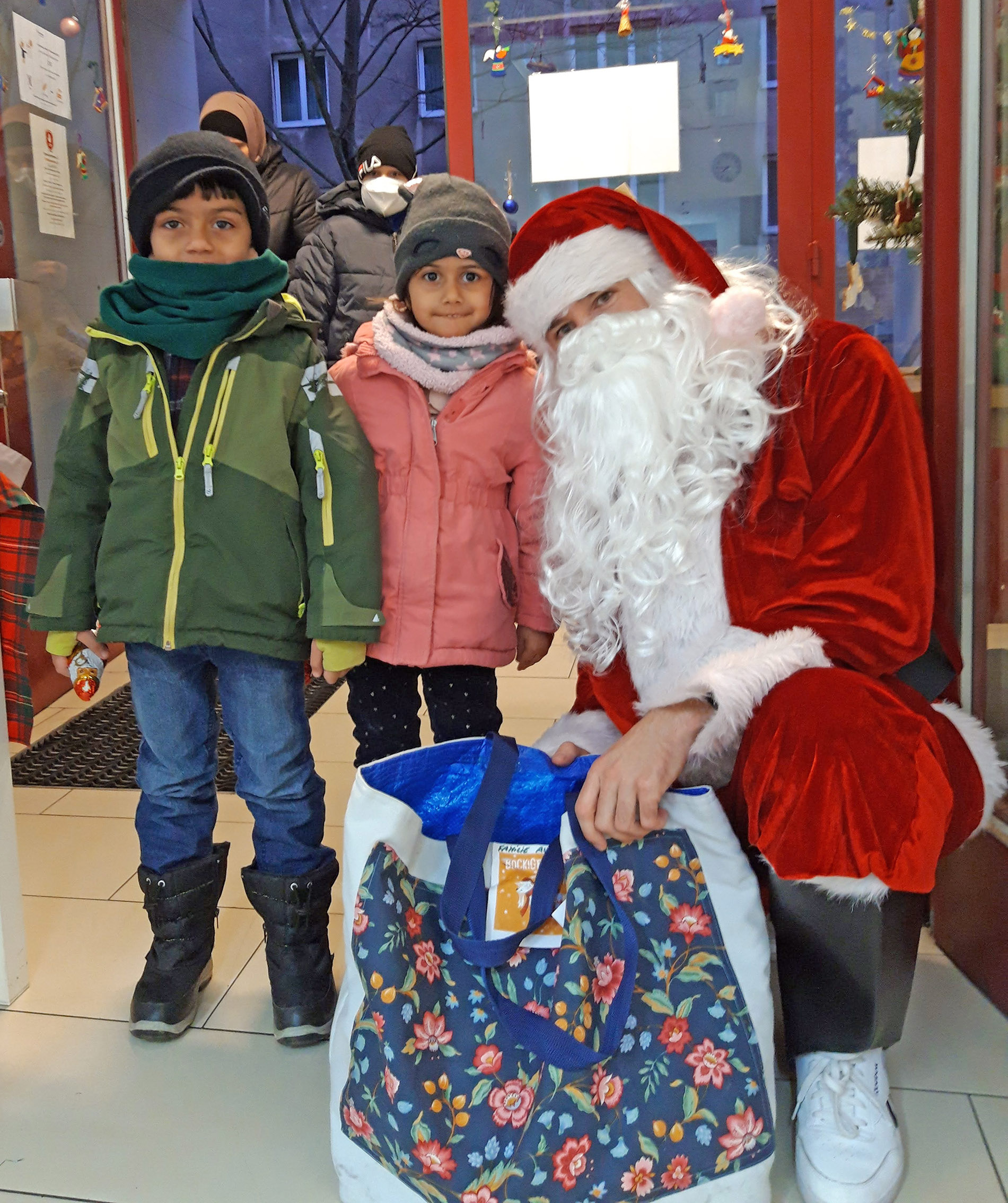 Nach der Bescherung in der Lernbetreuung eröffneten wir die Geschenkeabholstation am Eingang des Ute Bock Bildungszentrums. Jede Familie bekam einen eigenen Termin und hatte so einen Moment mit dem Weihnachtsmann und die Möglichkeit, ein gemeinsames Erinnerungsfoto zu machen.